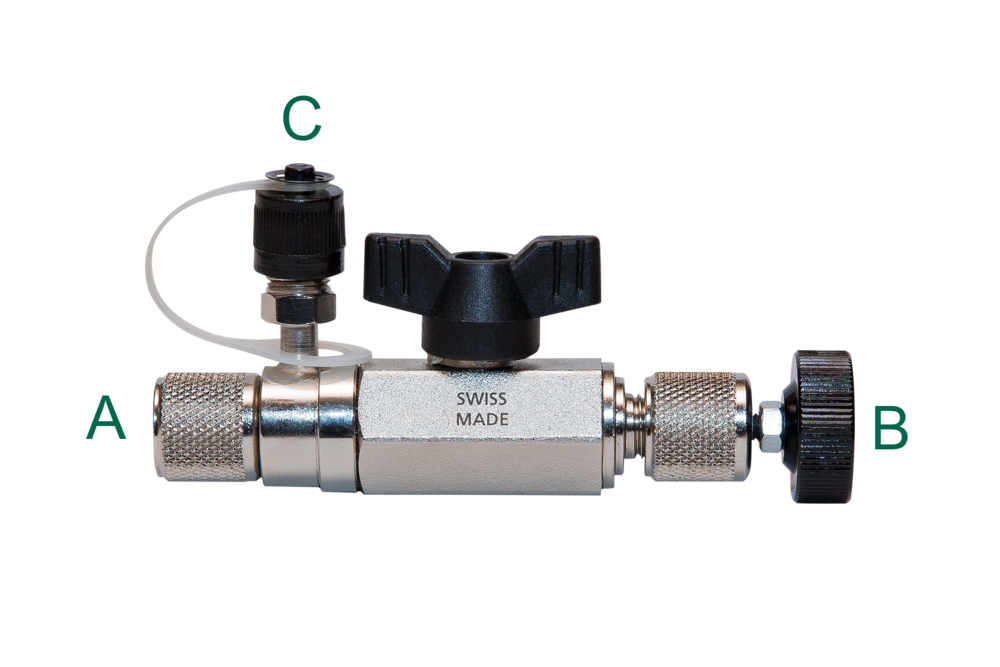 Schrader-valve tool with 1/4″ SAE connection, with 1/4″ SAE swivel outlet. Eliminating the Schrader-valve allows a higher flow rate, saving you valuable time during evacuation and filling. The shut-off valve allows you to replace a defective Schrader valve – even in systems under pressure.