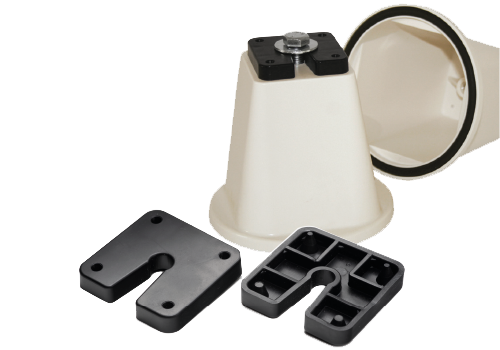 Kūginė atrama oro kondicionavimo įrenginiams, sukurta kaip estetiškai išskirtinis sprendimas, palyginti su įprastomis pastatomomis atramomis. Vibracijų slopinimas užtikrinamas apačioje esančiu O formos sandarikliu ir minkšta PVC plokštele, kuri taip pat leidžia išlyginti lauko oro kondicionavimo įrenginį, naudojant persidengiantį (sluoksniuotą) montavimą.